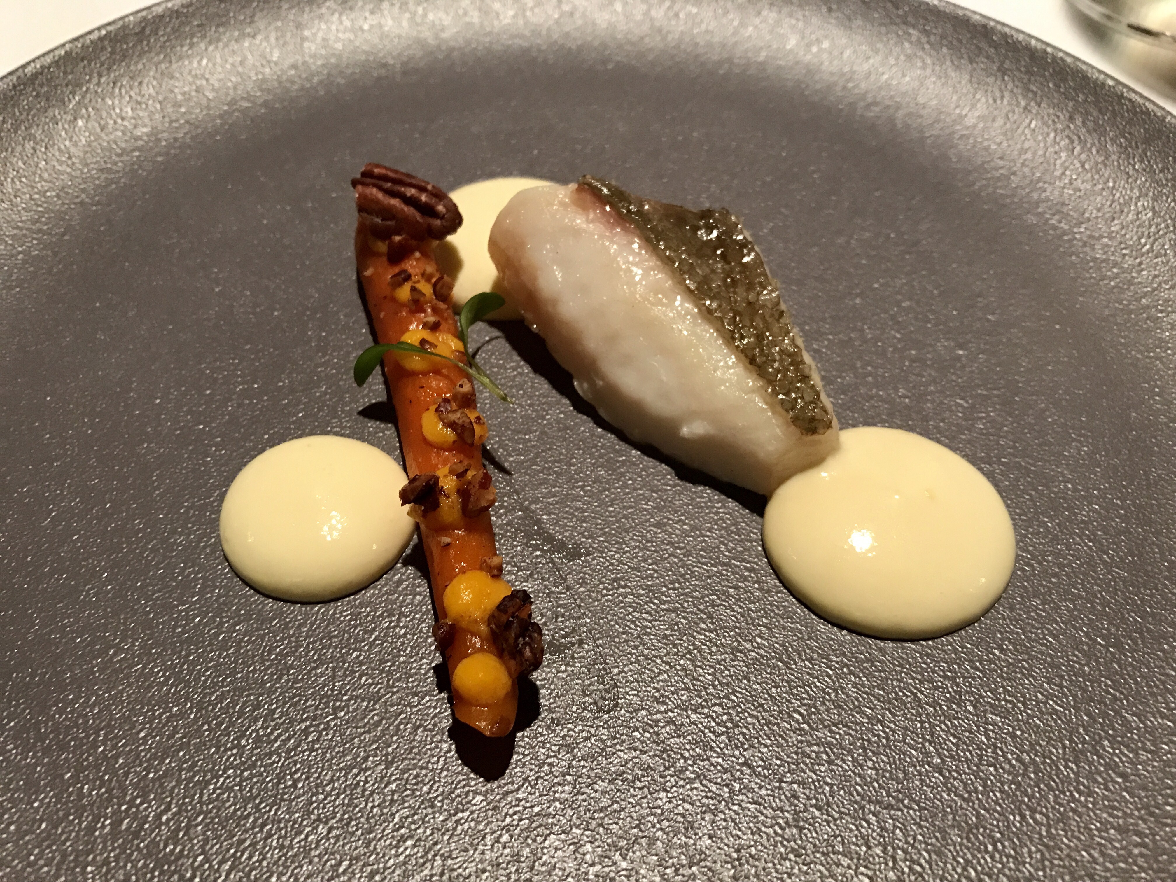 John Dory with carrot confit in peanut oil, toasted pecans, and beurre blanc. Another great dish. The John Dory was perfectly cooked, tender and juicy. The beurre blanc was perfect. The sweet tender carrot was amazing with the toasted pecans. 9/10 (I would have scored 10/10 if the skin of the fish had been crispy.)