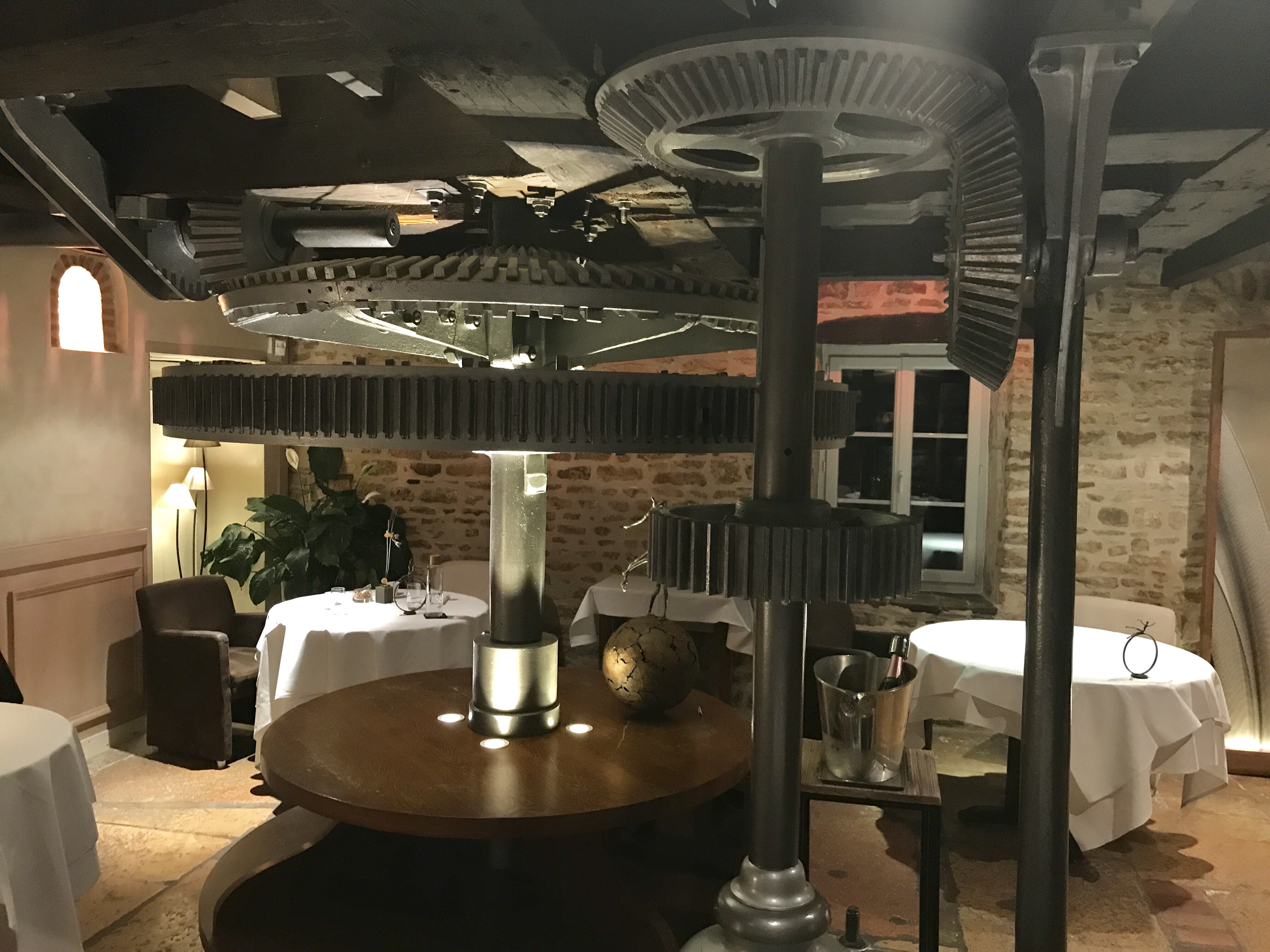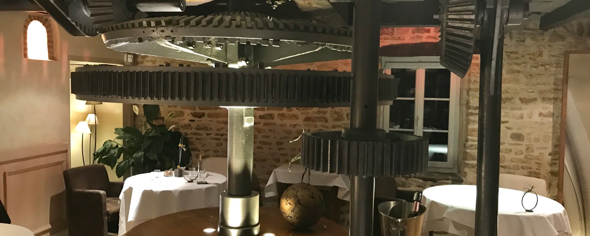In the dining room the old cogwheels are still there, which makes for a very nice ambiance. We opted for the chef’s ‘surprise’ 8- course menu (105 euros), which was not as surprising because it contained mostly the same dishes as the 5-course menu for 75 euros. The wine list only has French wines, and of course mostly from Burgundy with an impressive selection of Côte d’Or wines.
