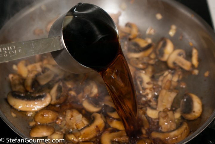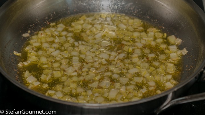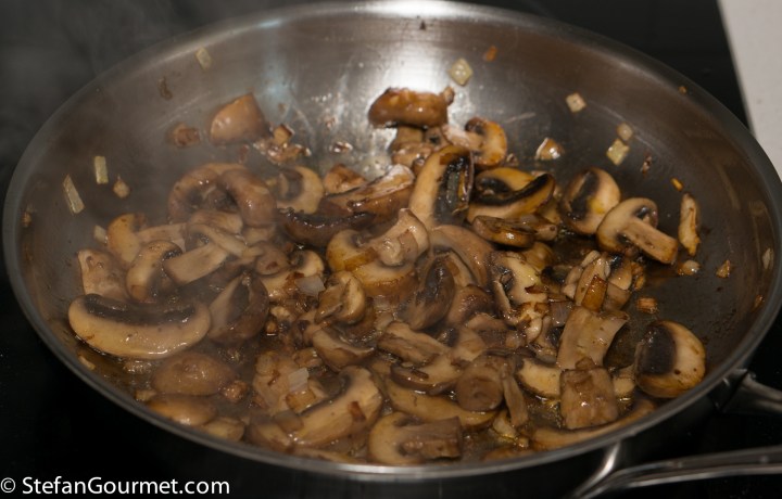 Add a minced shallot or clove of garlic to the fat that remains in the frying pan. (Note that I copied Nadia’s use of a shallot here, which is a bit of a French influence on this Italian dish. Italians would be more inclined to use garlic.)