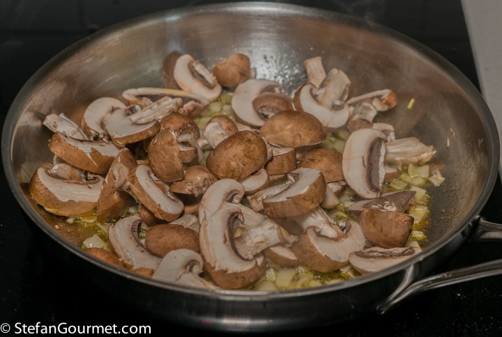 Stir for a minute, then add 250 grams of thickly sliced mushrooms.