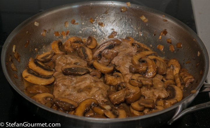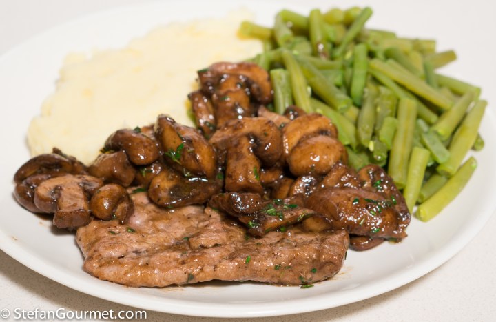 Serve the scaloppine with the mushrooms on preheated plates. I served mashed potatoes and green beans on the side.