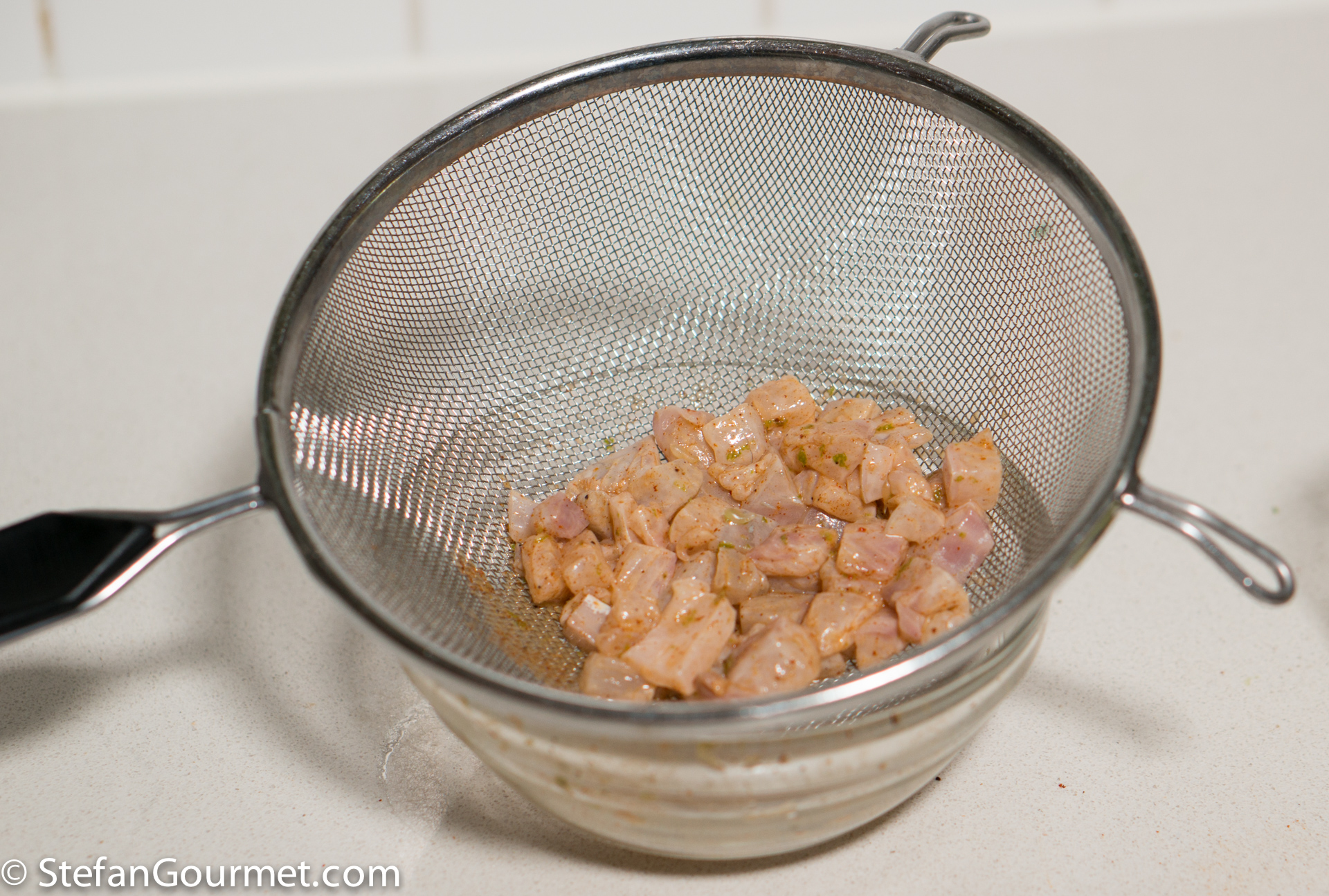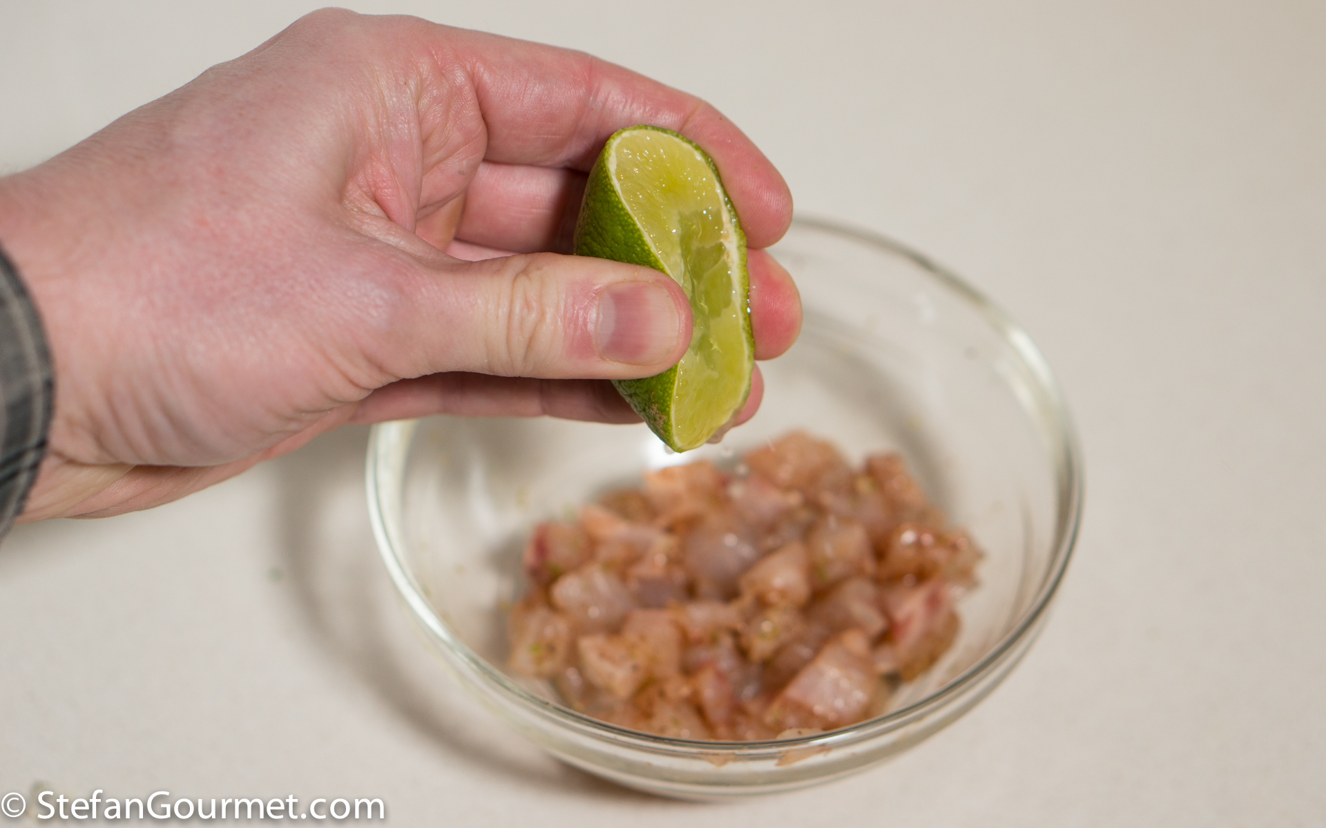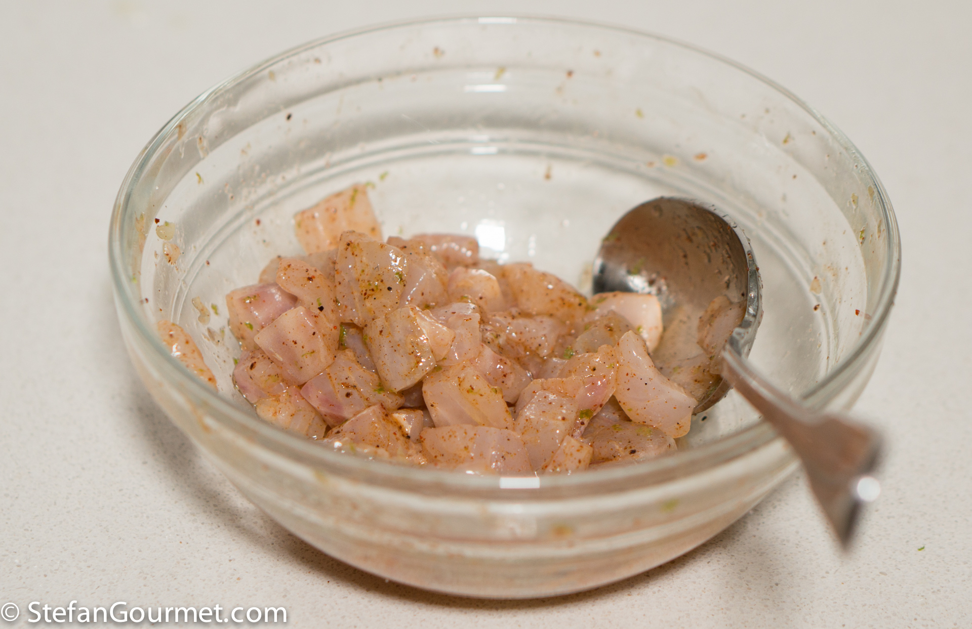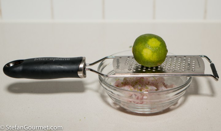 Dice the fish (about 5 mm or 1/4 inch) and put in a bowl, together with 1/4 teaspoon salt, 1/4 teaspoon New Mexico ground chiles, and a teaspoon of grated lime zest.