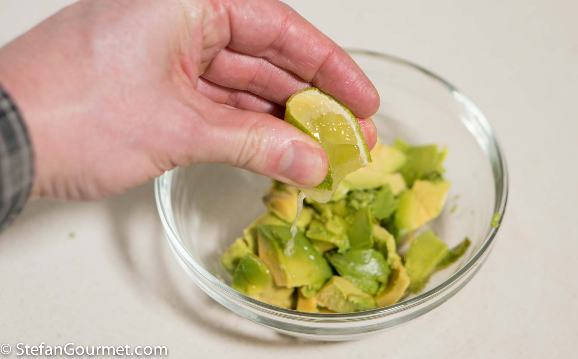 Meanwhile, remove the skin and seed from the avocado and put the flesh in a bowl. Squeeze the juice from the other half of the lime on the avocado, and add 1/4 teaspoon salt.