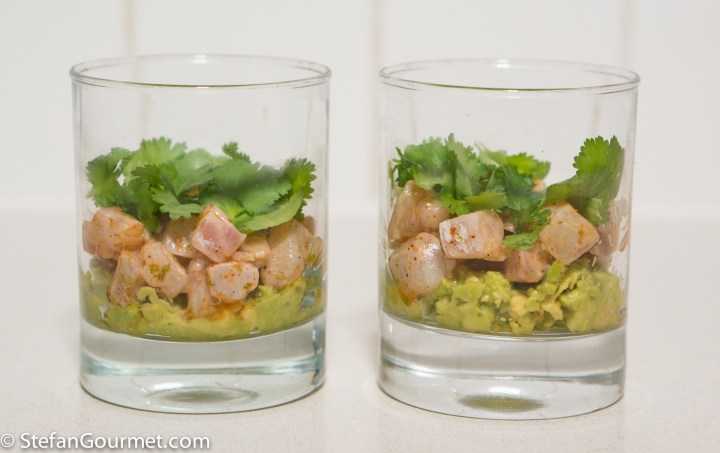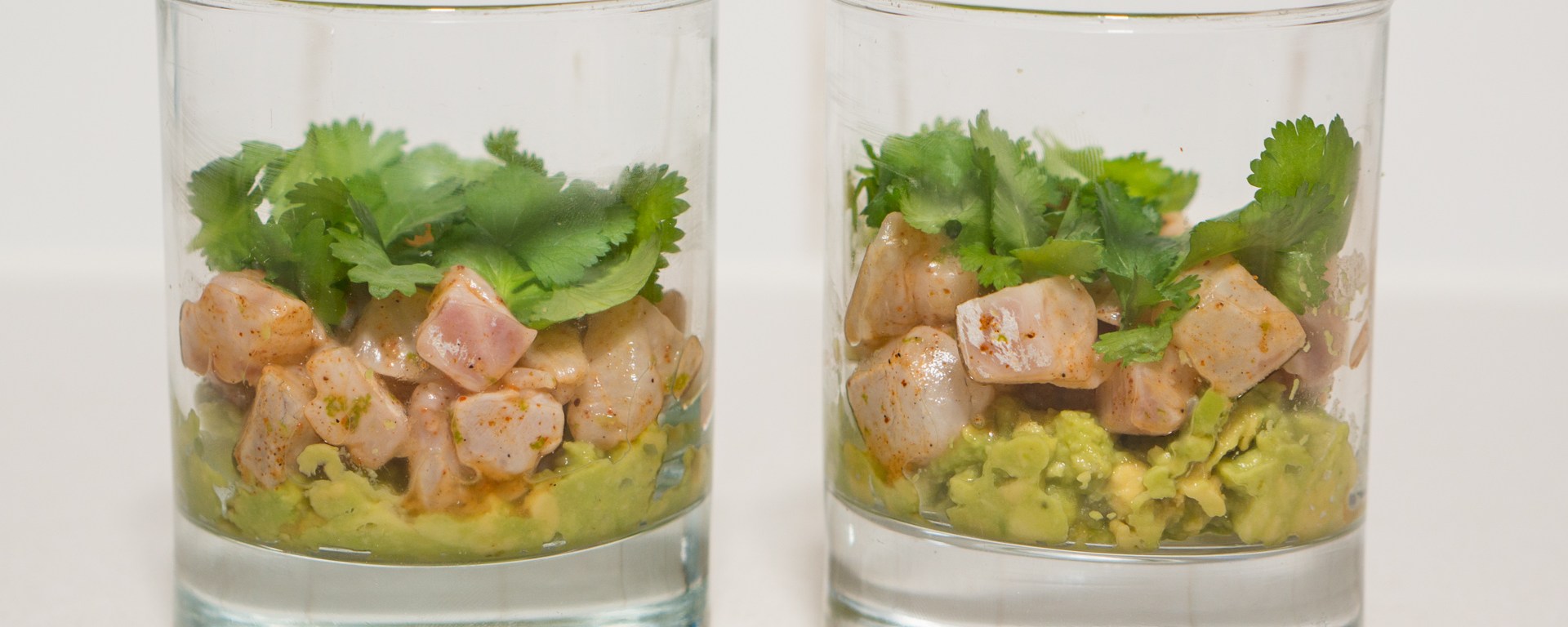 Put a layer of avocado in tumblers or martini glasses, topped with a layer of ceviche, and finish with fresh cilantro leaves. Serve at once (as the lime juice still present will continue to ‘cook’ the fish).