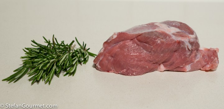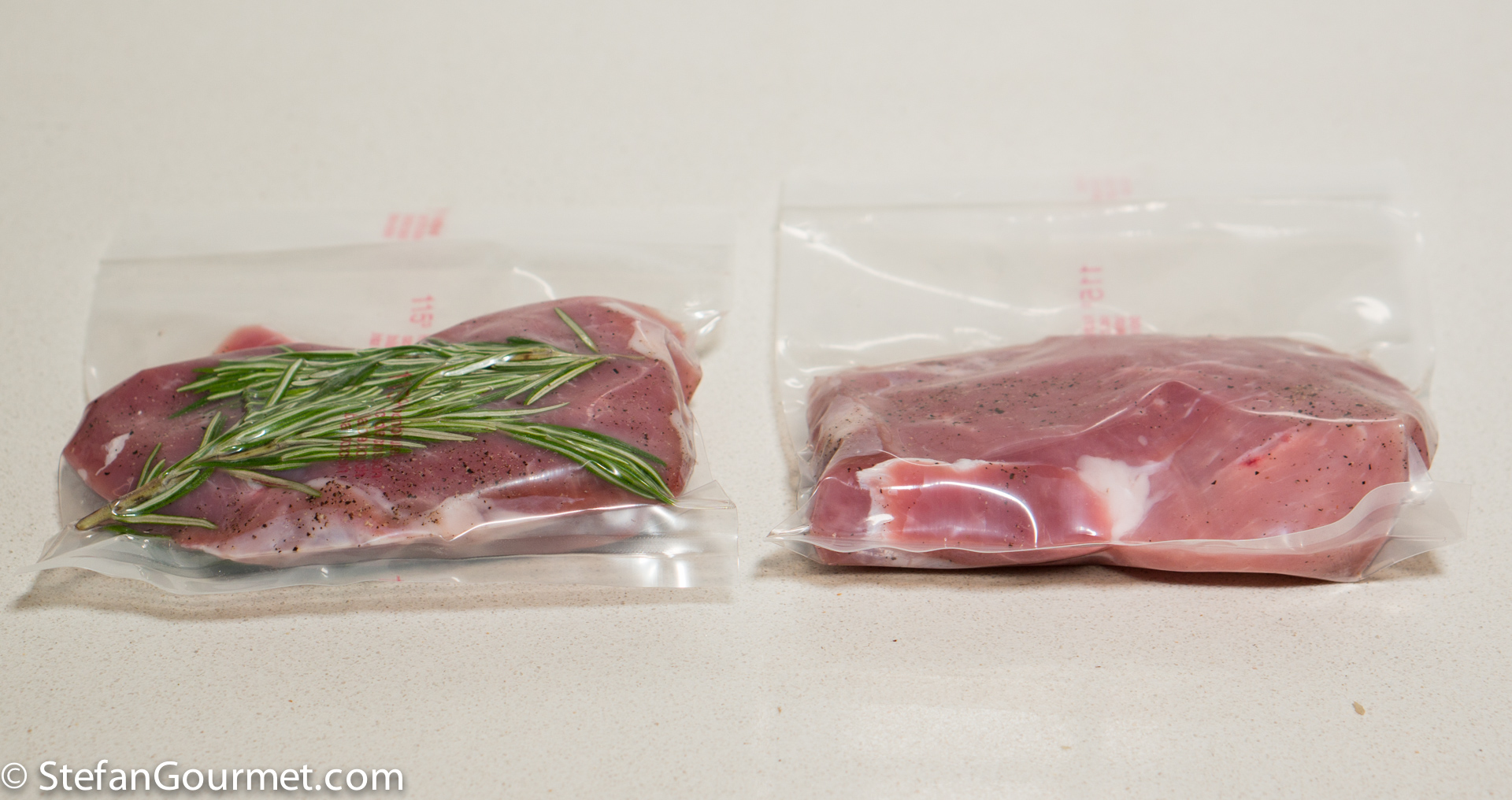 I started with a nice piece of leg of lamb, that I cut into two pieces. Then I seasoned both pieces with salt and freshly ground black pepper, and vacuum sealed one of them with a generous amount of fresh rosemary. The other piece was vacuum sealed without rosemary.