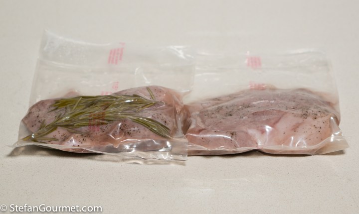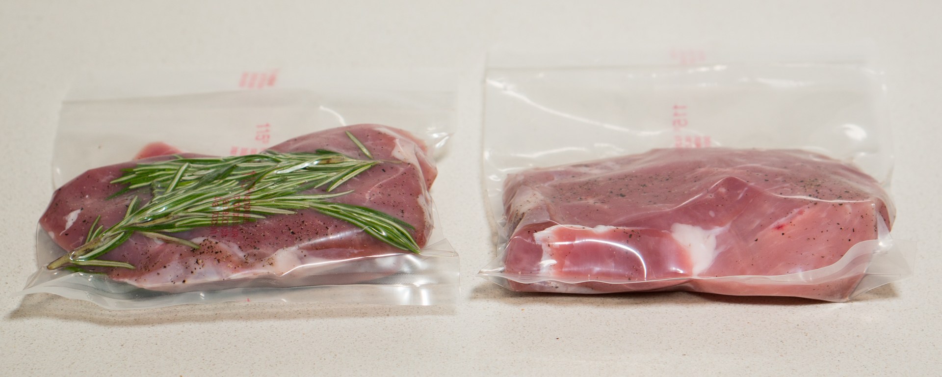 One of these questions is whether or not it makes sense to include herbs in the bag when you cook meat sous-vide. There was some debate about this and one member stated that because there are juices in the bag at the end of the cooking, that means that flavor only goes out of the meat and does not go in. That didn’t make any sense to me, but to make sure I decided to do a side-by-side experiment.