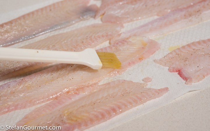 Preheat the oven to 200C/400F, preferably with the broiler turned on. Season the sole fillets with salt and freshly ground black pepper on both sides.