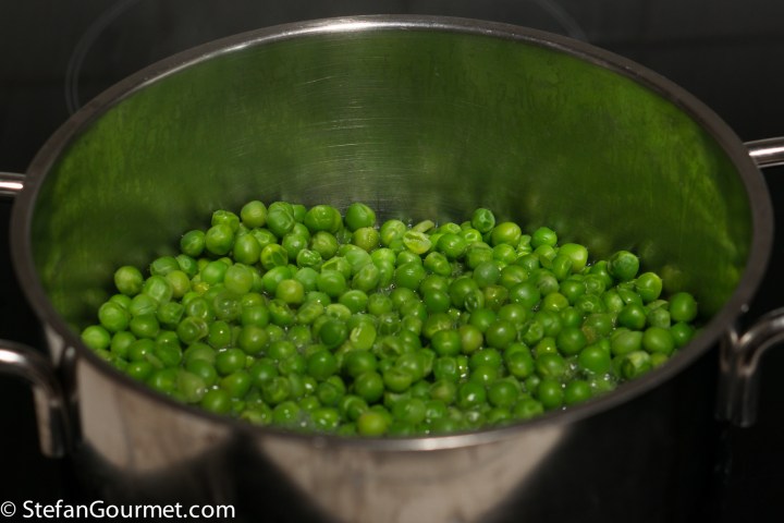 Meanwhile, boil the peas in salted water until tender. Add a pinch of baking soda to the cooking water to cook them more quickly and preserve the bright green color (optional).