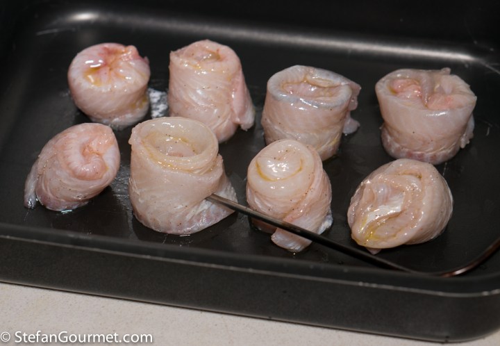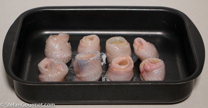 Arrange the sole rolls in an oven proof baking dish, preferably non-stick.