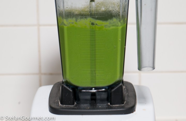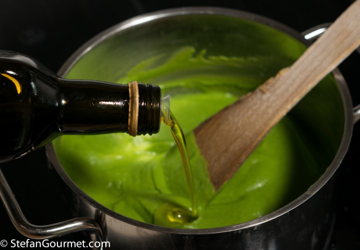 Transfer the pea puree to a saucepan and add some good quality extra virgin olive oil to taste. Taste and adjust the seasoning with salt and freshly ground black pepper.