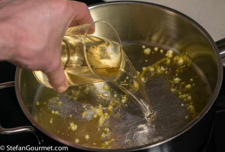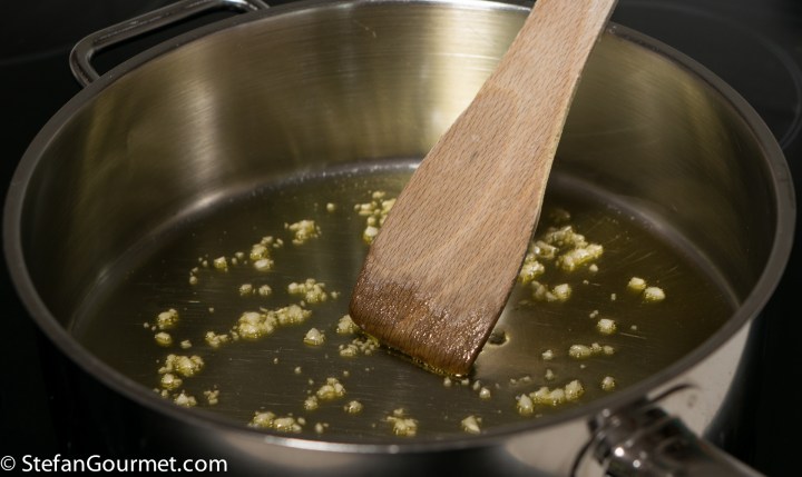 To make the sauce, sauté a minced clove of garlic in 2 tablespoons of olive oil. Do not allow the garlic to color.