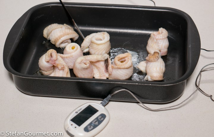 Bake in the oven (if using a broiler, close to the top) until the sole has just been cooked through, about 15 minutes. If using the thermometer, pull the sole when it reads 45C/113F. The carry-over heat will continue to cook the sole. Do not overcook the sole.