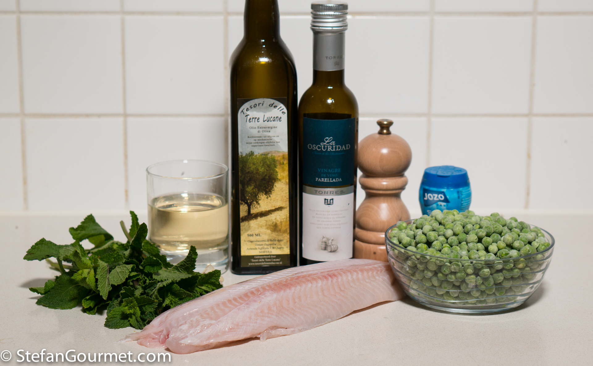 This is an elegant dish for a dinner party that is easy to prepare. Flatfish with mint sauce is a combination I saw in one of Biba Caggiano’s cookbooks. In this case I used sole. If turbot is the king of flatfish, then sole certainly is the queen. But you could also use turbot or even flounder. Mint works well with peas, and the fennel salad adds a nice crispy element. This is one of those dishes where each bite should include a little bit of everything on the plate for the best experience.