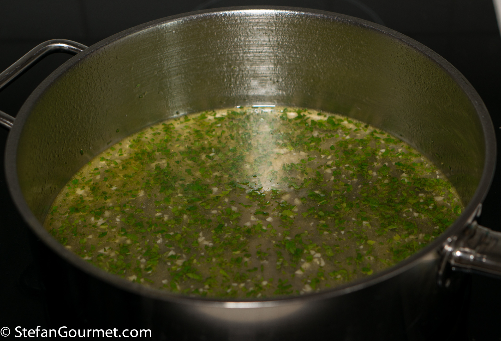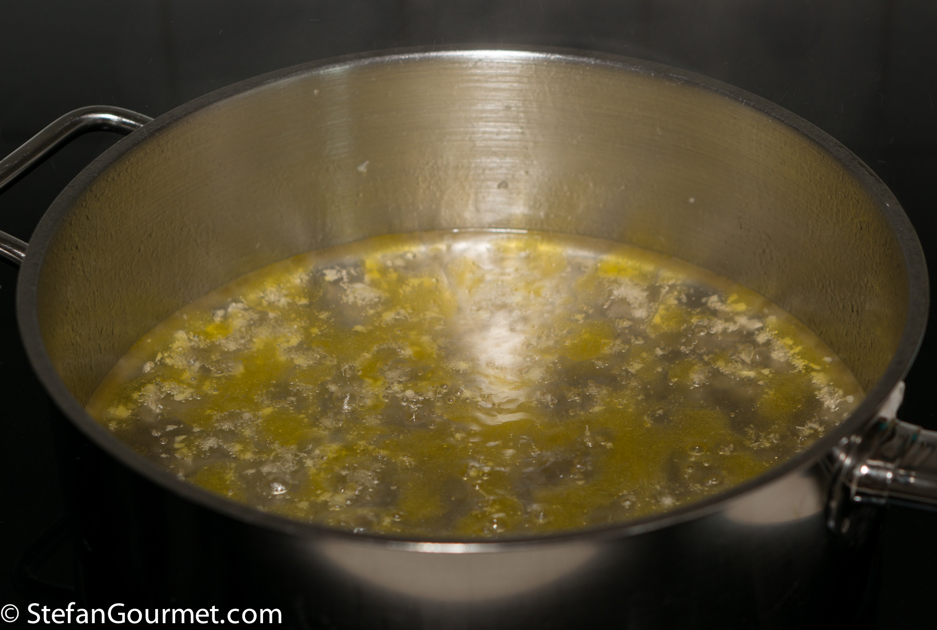 To make the sauce, sauté a minced clove of garlic in 2 tablespoons of olive oil. Do not allow the garlic to color.