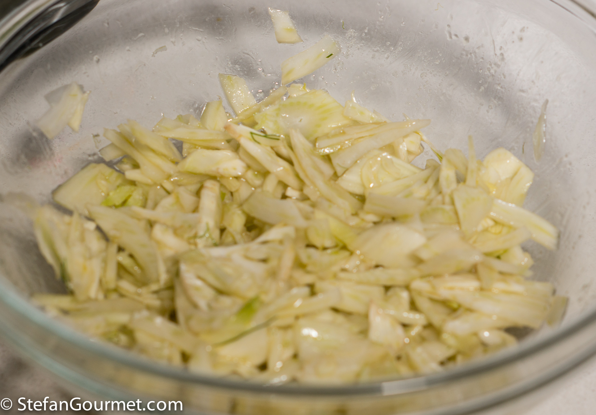 Shave the fennel thinly, removing the tough core and the fronds, and dress with extra virgin olive oil and salt.