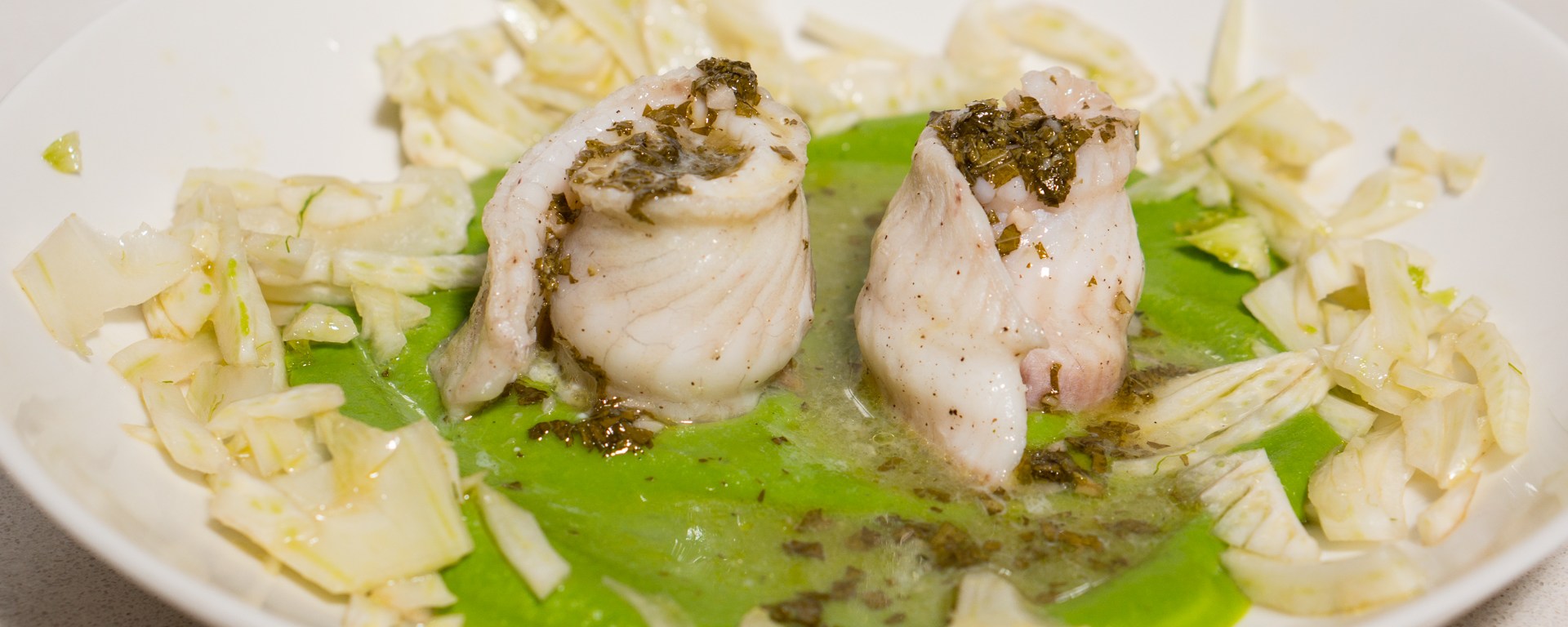 If you timed everything perfectly, you can now assemble the dish. Start with a layer of pea puree in the middle of the plate, and surround it with fennel. Arrange two sole rolls on each plate, and spoon some of the mint sauce on top of the sole. Serve at once and enjoy.