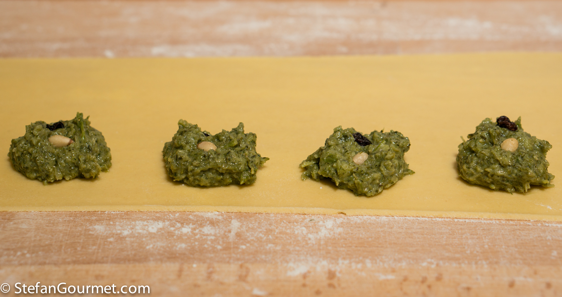 Make pasta dough using 2 eggs, allow it to rest in the refrigerator, covered in plastic wrap, for at least half an hour, then roll it out to the thinnest setting and make ravioli using the prepared filling. Click here to read how to make ravioli. Each 1 pine nut and 1 currant to the filling of each ravioli.