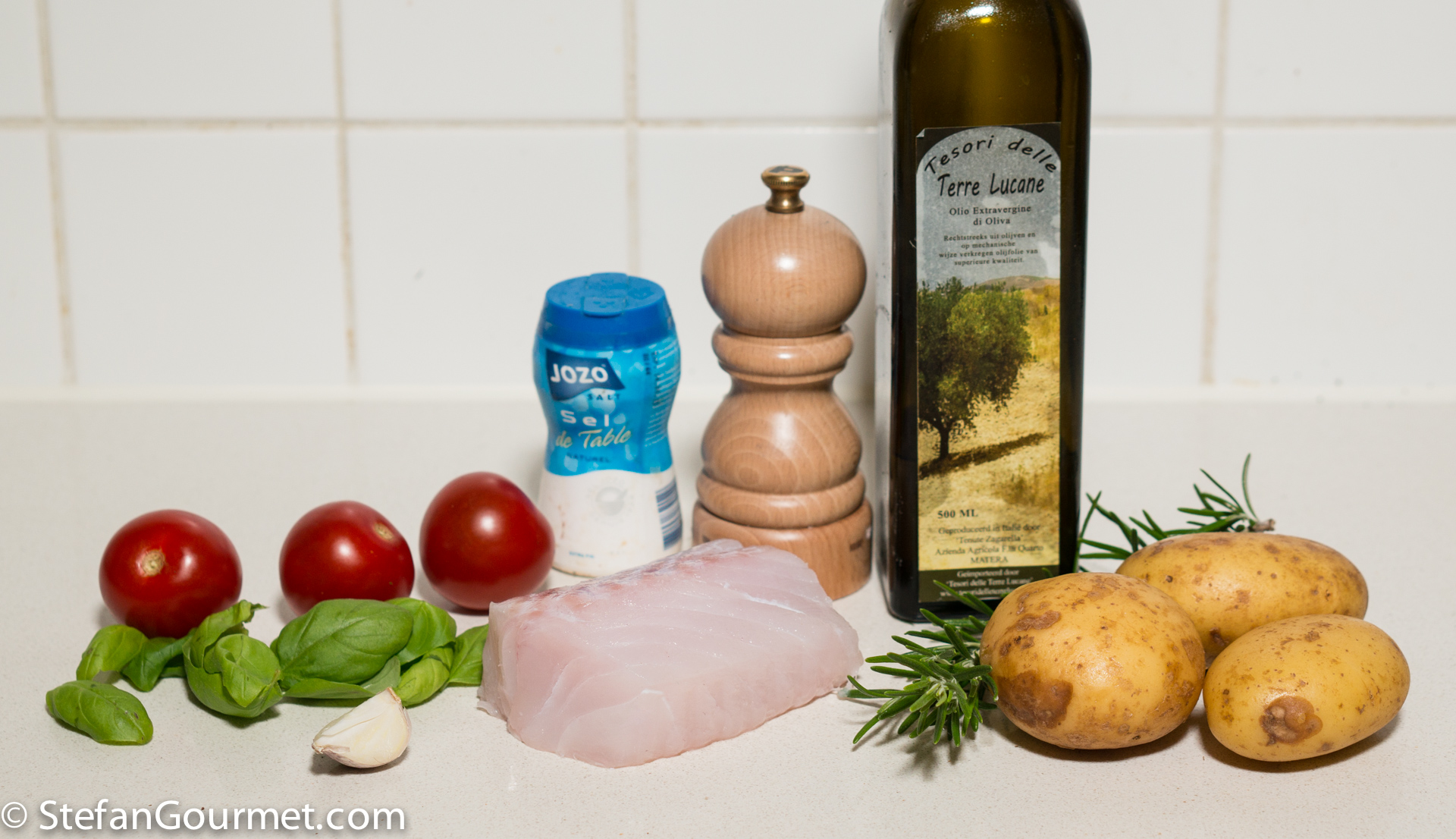 If it’s too hot right now to turn on the oven where you are, save this recipe for later, because it is easy and delicious. Cod, potatoes, and tomatoes are all cooked together in the oven with garlic and herbs (the tomatoes with basil, the cod and potatoes with rosemary). The only difficult part to get right is the timing, because the potatoes should be golden when the fish is just cooked through. Cod is even more susceptible to overcooking than other types of fish, and will become bland and dry if you are not careful. And so the potatoes and tomatoes go in the oven 10 minutes before the fish. To take the guesswork out of getting the fish right, it is advisable to use a thermometer with a probe.