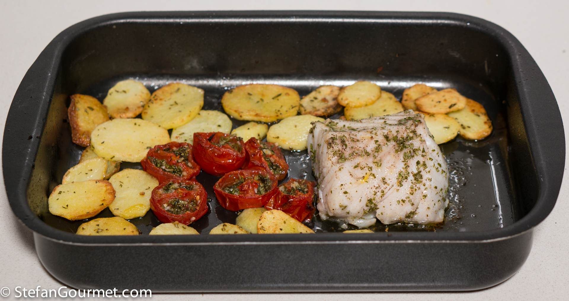 Turn the potatoes and put the cod in the same oven dish, with the probe of the thermometer inserted in the center (if using).