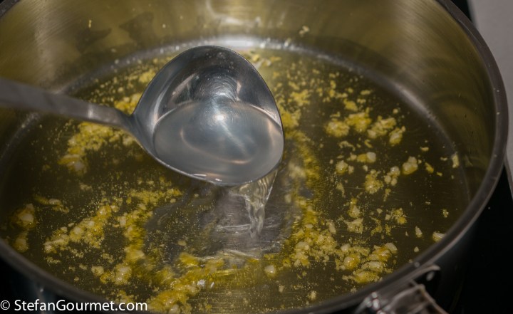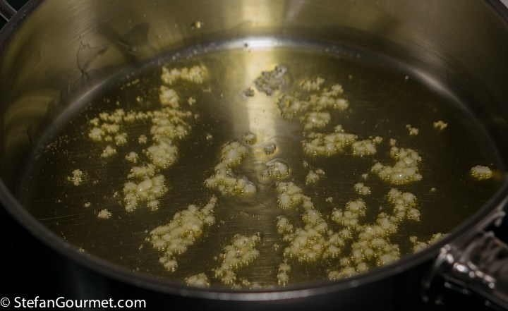Heat 2 tablespoons of the extra virgin olive oil in a frying pan and add a minced clove of garlic. Stir over low heat to infuse the oil with garlic, but make sure the garlic stays white or very lightly golden. Browned garlic would ruin the delicate flavor of this dish.