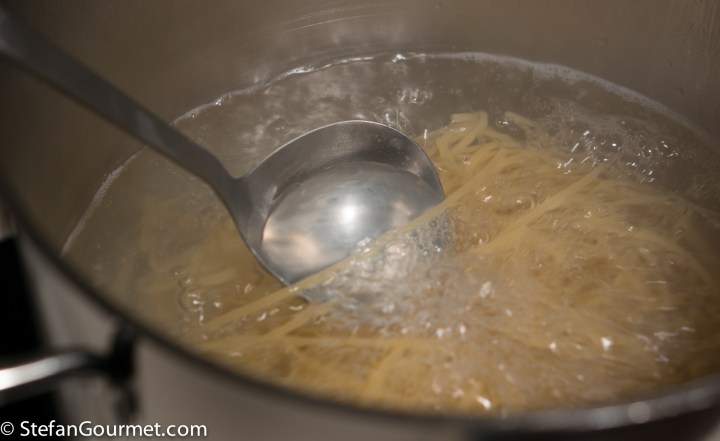 When the spaghetti is almost cooked, scoop out a few tablespoons of the cooking water…