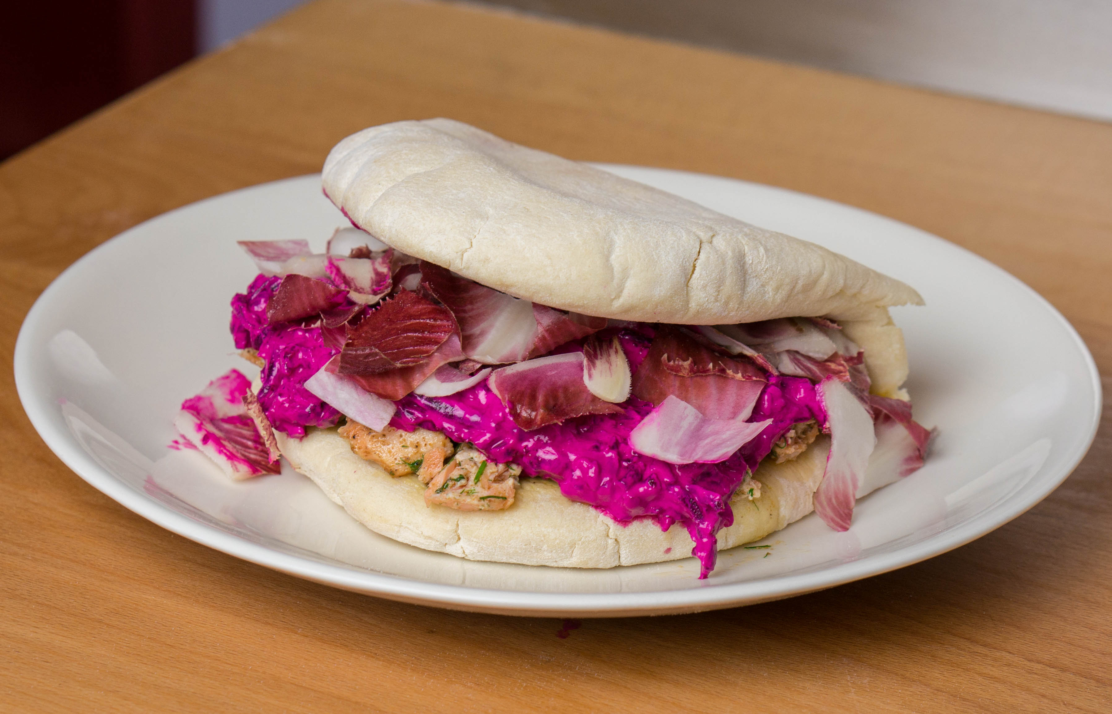 Pita bread with shawarma, usually lamb or pork, is popular street food in the Netherlands. This salmon shawarma with beet tzatziki on pita bread is a completely different take that is absolutely delicious.