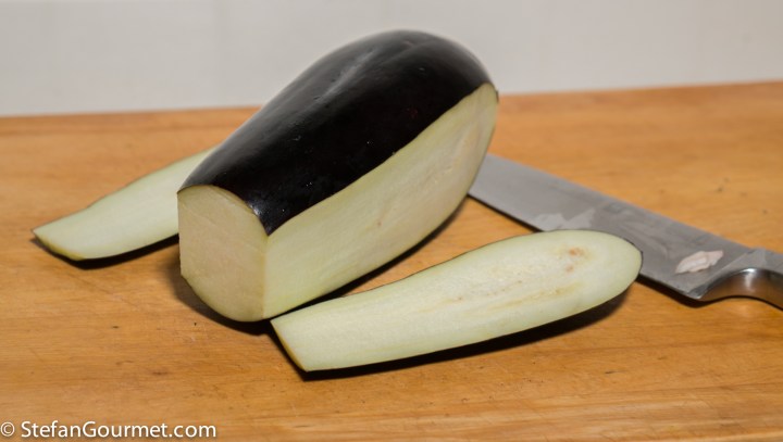 Cut that piece into 4 slices of equal thickness that have skin on the sides. If you do this with both eggplants, you should end up with 8 slices.