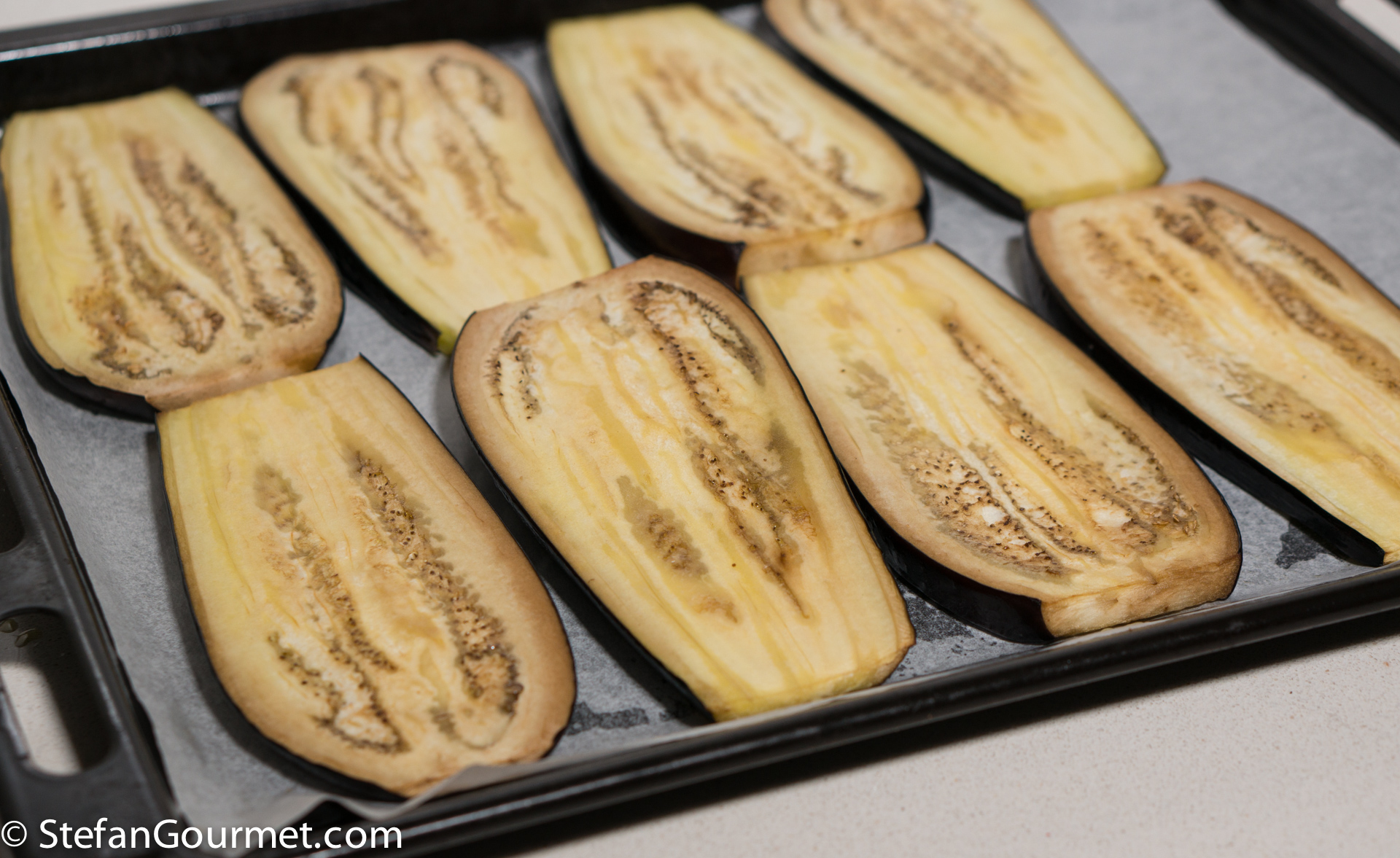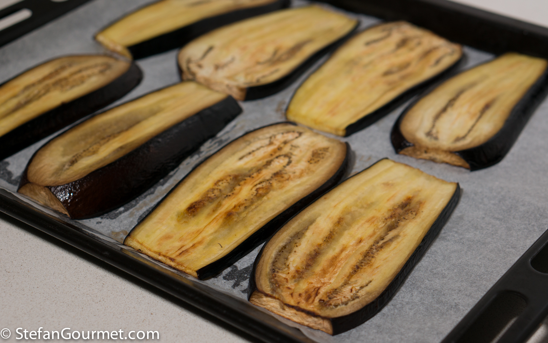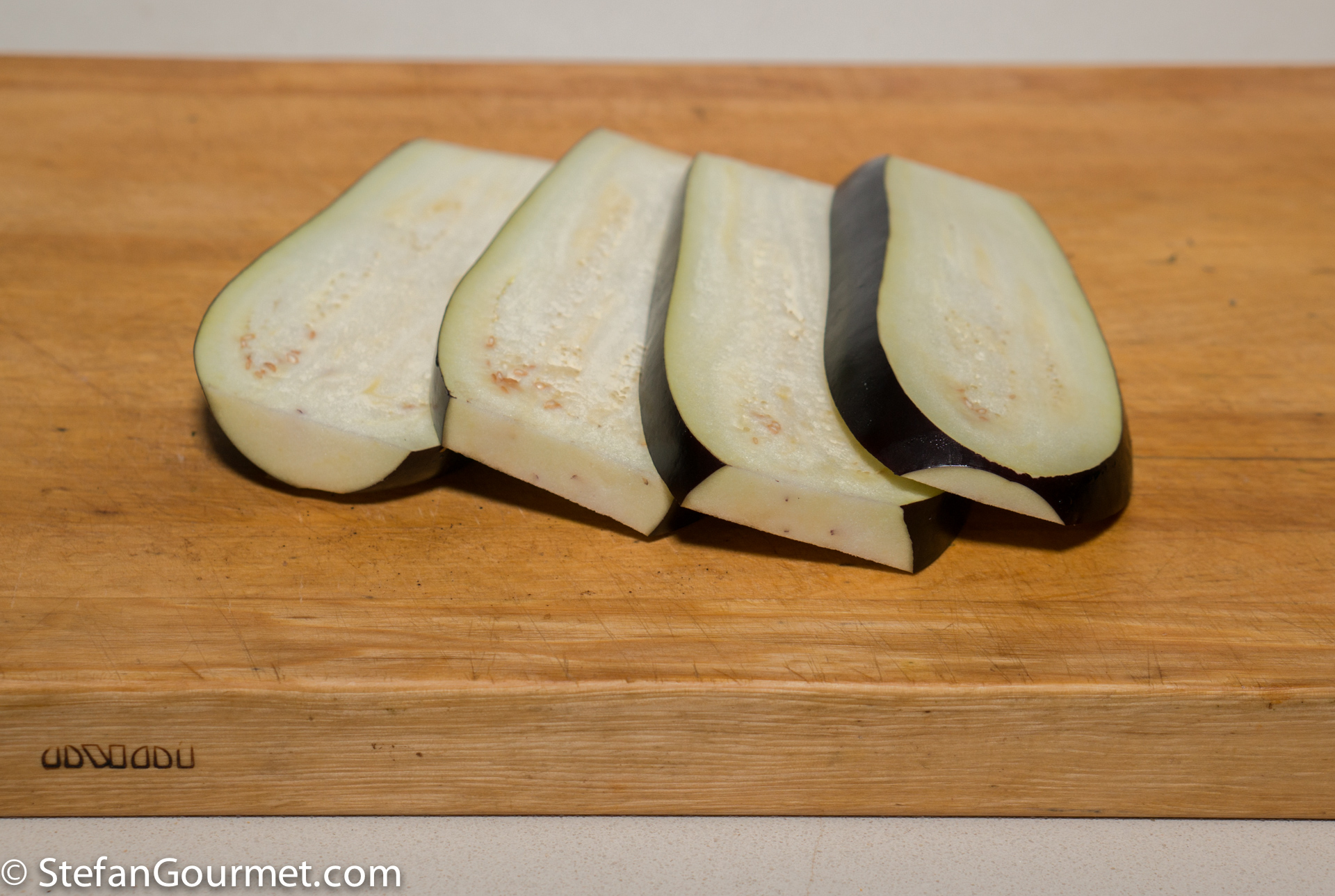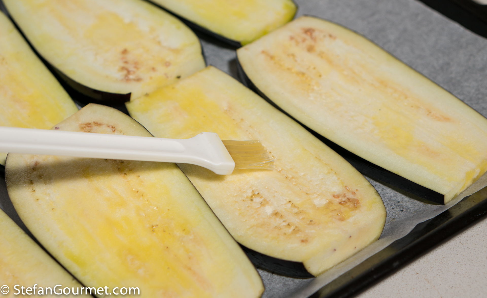 You could salt the eggplant slices and let them rest for an hour to draw out the juices, but that is not really necessary as today’s cultivated eggplants are not bitter anymore.
