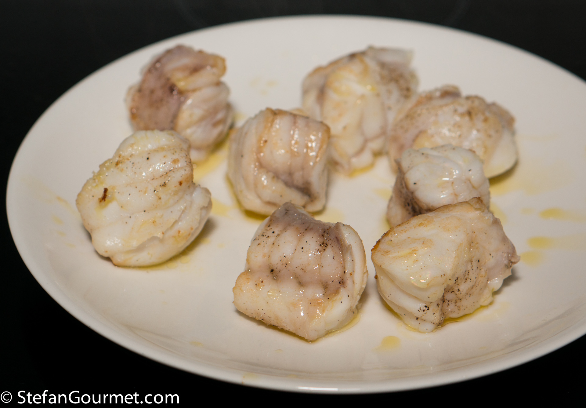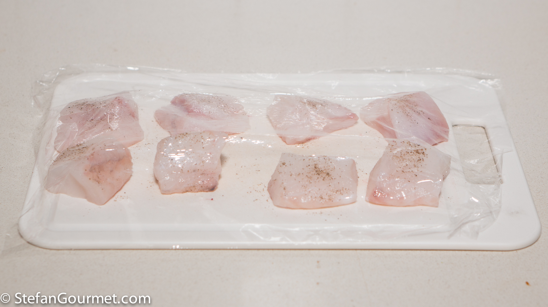 Cut the monkfish into 8 equal pieces and season them on all sides with salt and freshly ground black pepper. Cover with plastic wrap and refrigerate for an hour to lightly cure the monkfish.
