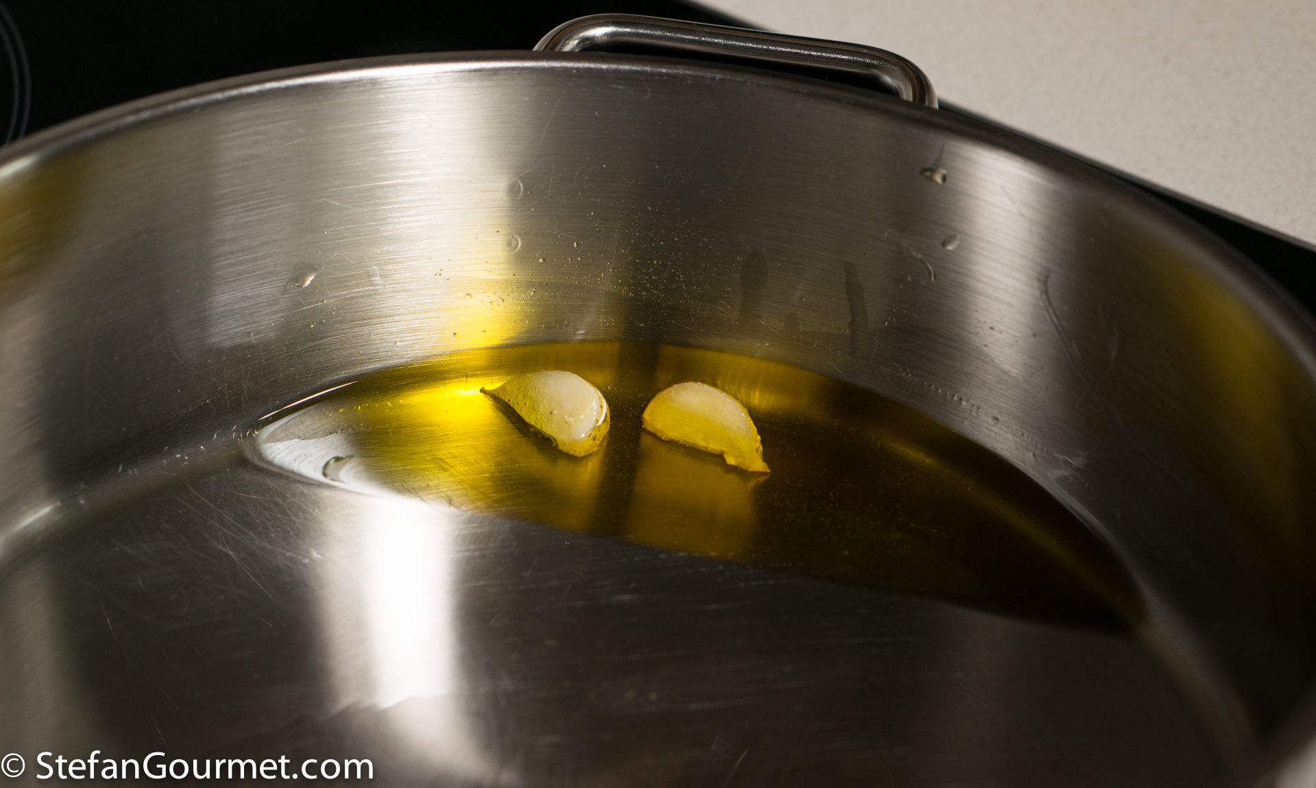 While the eggplant is baking, prepare the tomato sauce. Heat 2 tablespoons of olive oil in a frying pan. When the oil is hot, turn off the heat and tilt the pan. Put a garlic clove (cut into two pieces) in the oil and allow the garlic to gently sizzle in the oil until it is lightly golden, then discard the garlic. This will flavor the oil with the garlic while you won’t actually be eating the garlic.