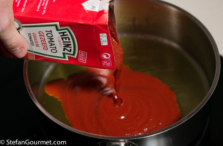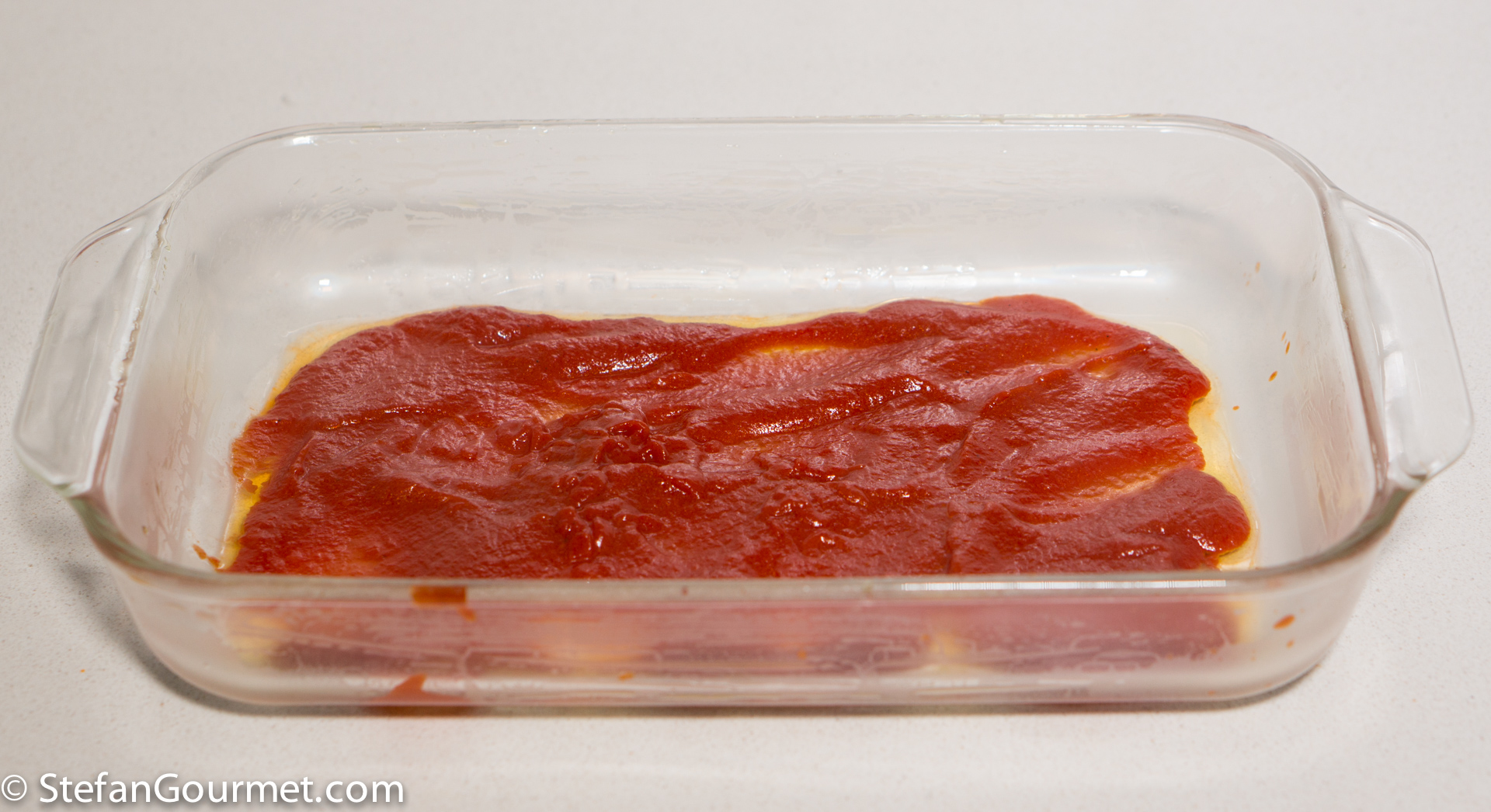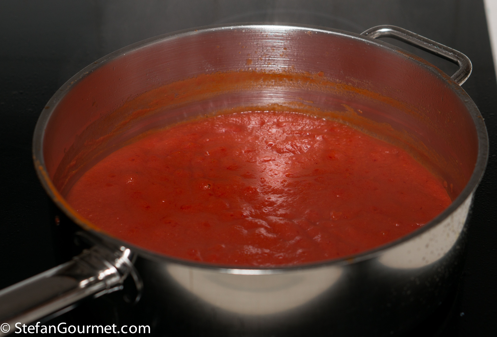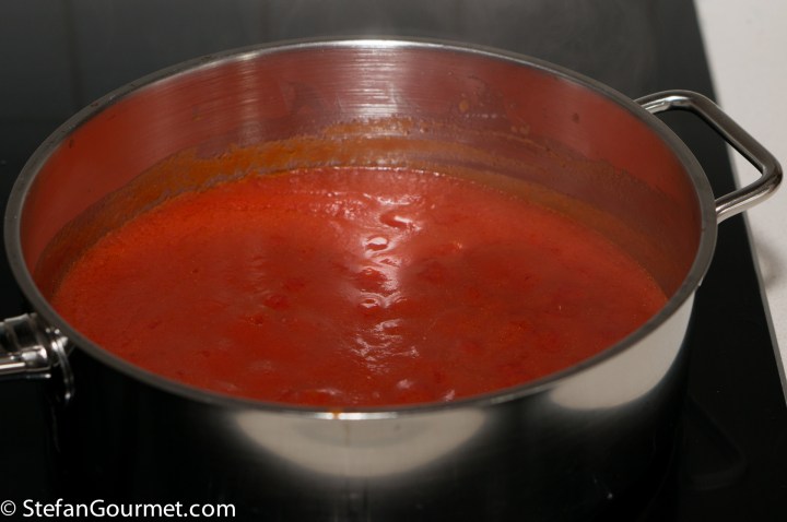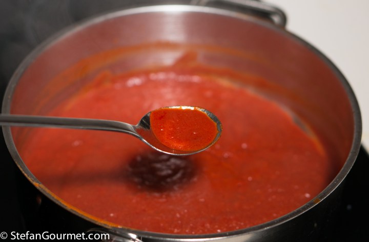 Simmer the tomato sauce until it is no longer watery (you can tell when stirring leaves a track that doesn’t close up right away).