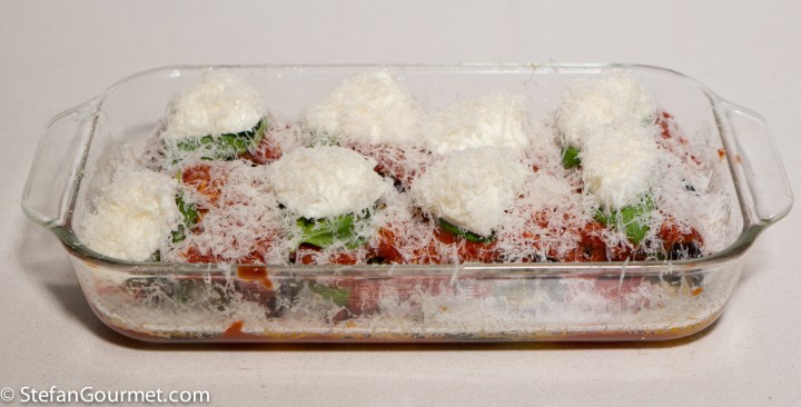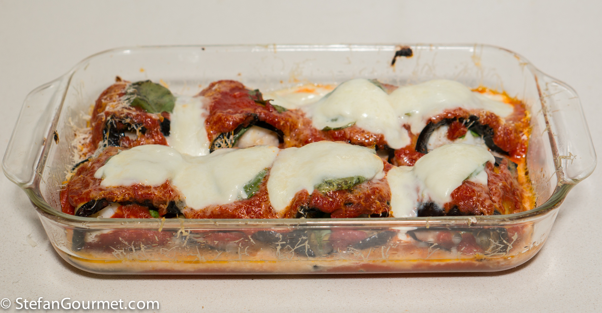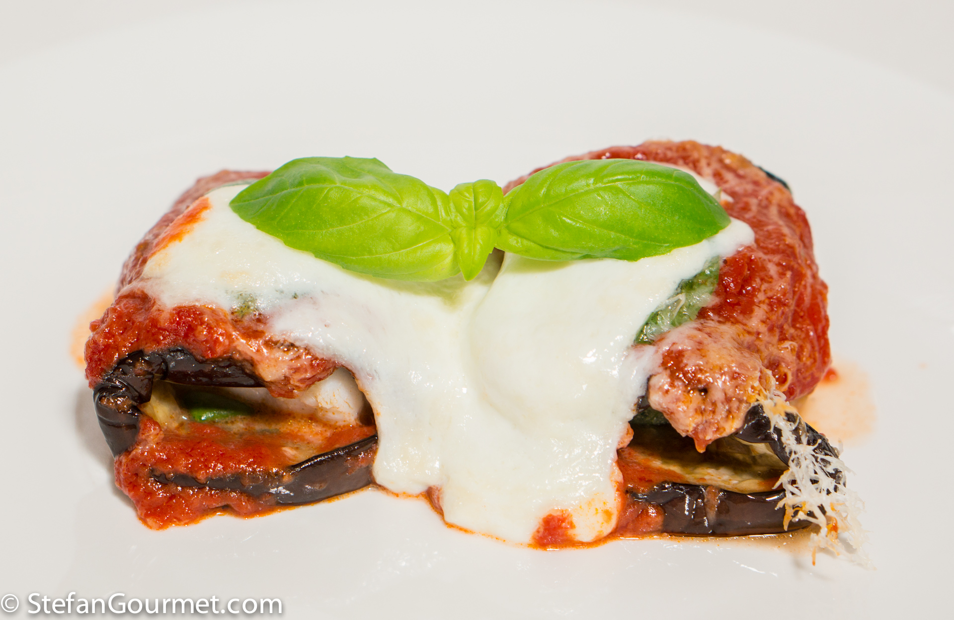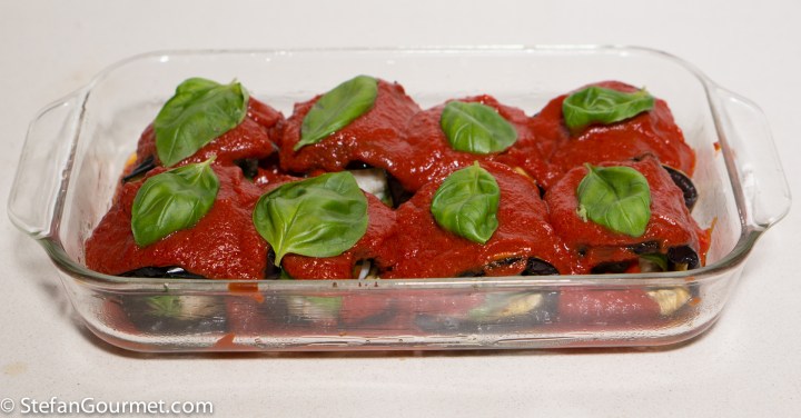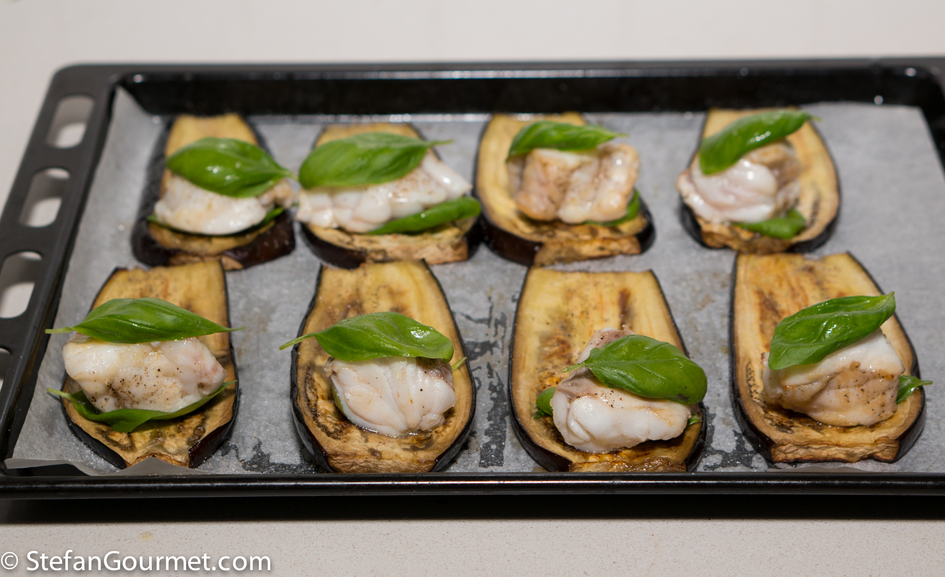 Up to this point the dish can be assembled beforehand and refrigerated. If you want to do that, make sure to allow the monkfish, eggplant, and tomato sauce to cool to room temperature before assembling the dish. Then cover and refrigerate it.