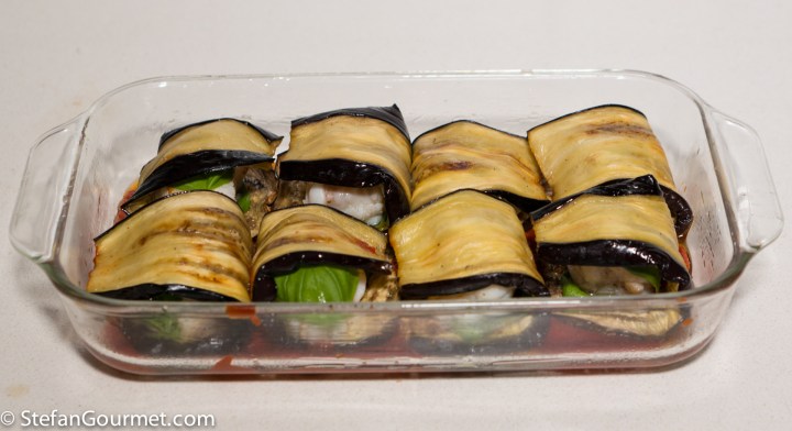 Roll up the eggplant around the monkfish and basil, and arrange in the baking dish in a single layer.