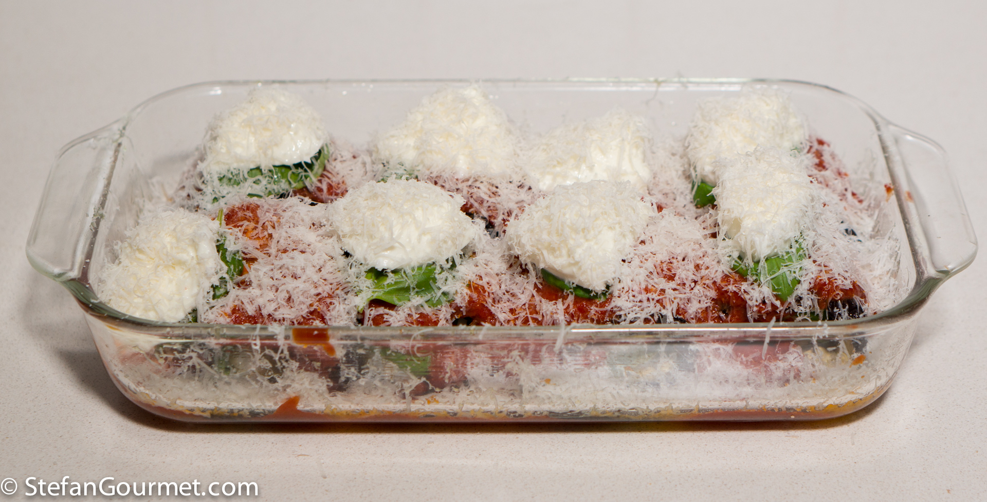 Cut the mozzarella into 8 pieces, and put a piece of mozzarella on top of each roll. Sprinkle everything with freshly grated parmigiano reggiano.