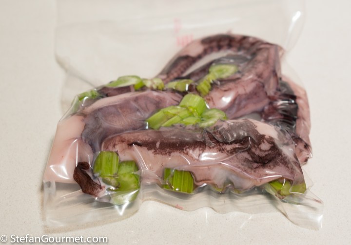 Vacuum seal the octopus with celery and a little bit of salt (plus other aromi if you like, such as a bay leaf or juniper berries).
