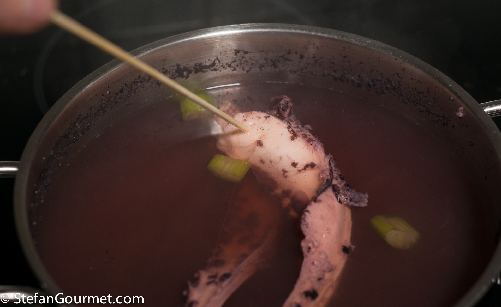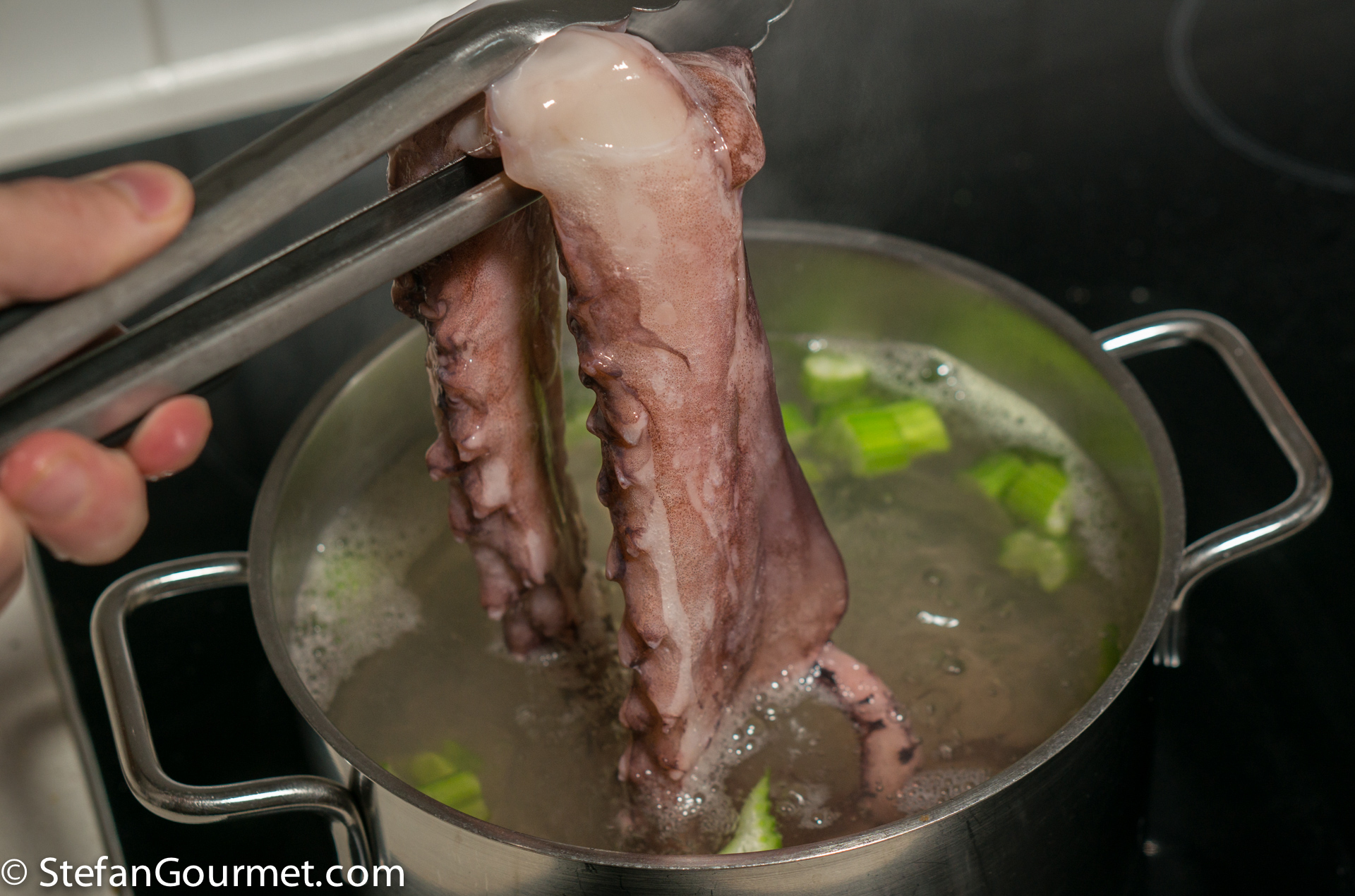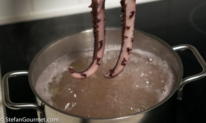 Clean the octopus if needed. Bring a pot of water to a boil. Add just a bit of salt and some celery (plus other aromi if you like, such as a bay leaf or juniper berries). When the water boils, plunge the octopus in there…