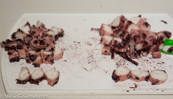 The traditionally cooked octopus is on the left, the sous-vide is on the right. The traditionally cooked seemed to have shrunk just a bit more.