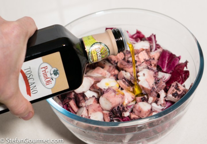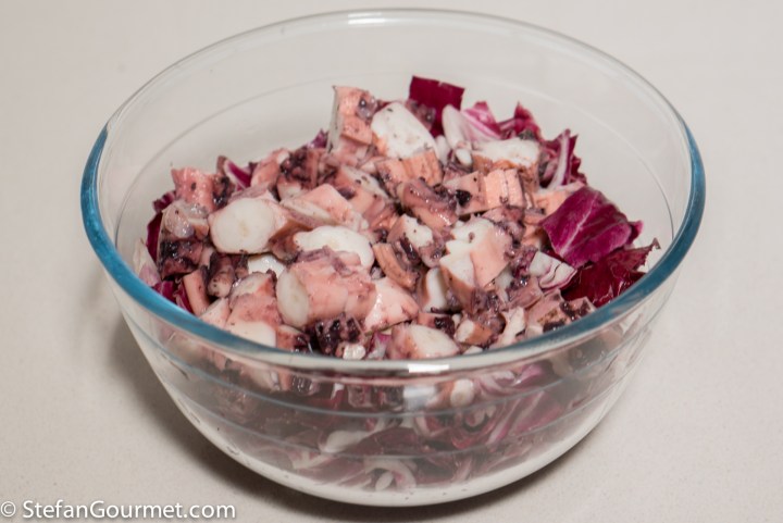 Put the radicchio in a large bowl together with the sliced octopus.