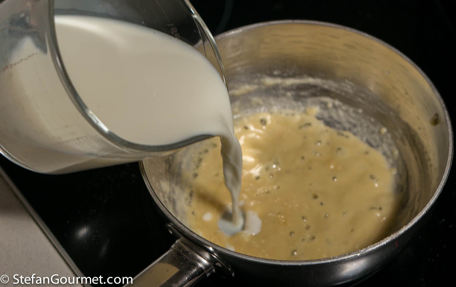 Stir for about a minute over low heat and make sure the butter and flour are well mixed. This is called a roux, which can be used to thicken other sauces as well. It can be cooked longer to make a brown roux, but for a white sauce you will need a white roux. (Many recipes tell you to cook until the roux until it no longer tastes like raw flour, but I have never needed to taste the roux.)