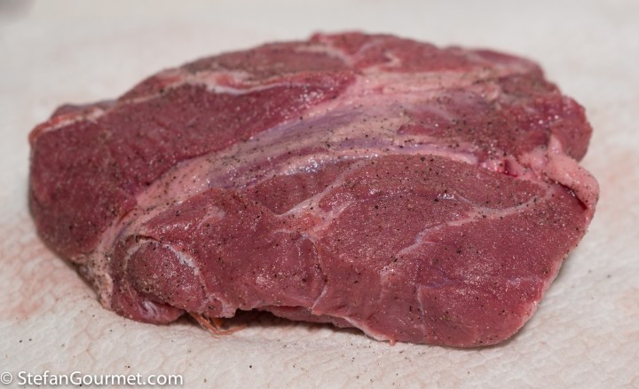 Pat the meat dry with paper towels and season with salt and freshly ground black pepper on all sides.
