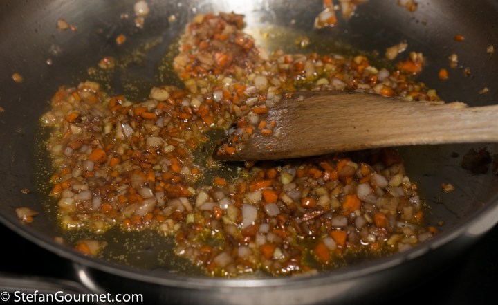 Stir over medium heat with a wooden spatula, scraping along the bottom to include all the browned bits in the sauce, until the vegetables are golden, 5 to 10 minutes.