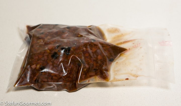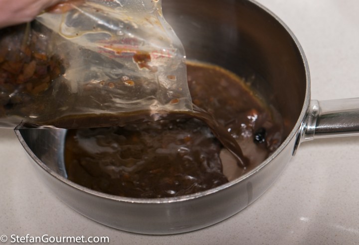 When you take the meat out of the sous-vide, cut the bag open and pour the sauce into a saucepan. Wrap the meat in aluminum foil to keep it warm while you finish the sauce.