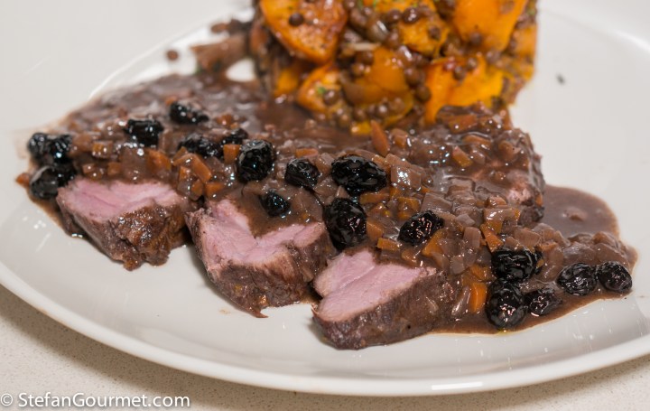 Slice the meat and serve it with the sauce on preheated plates.