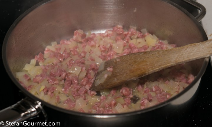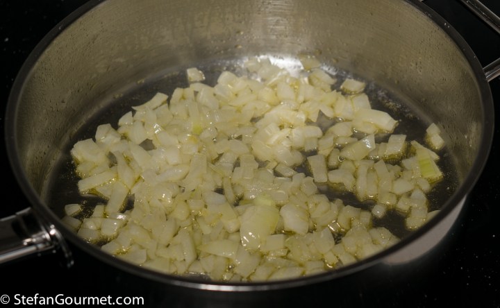 Make the ragù while the ravioli are drying. Heat 2 tablespoons of olive oil in a frying pan. Add a chopped onion and season lightly with salt. Stir until the onion is translucent, about a minute.