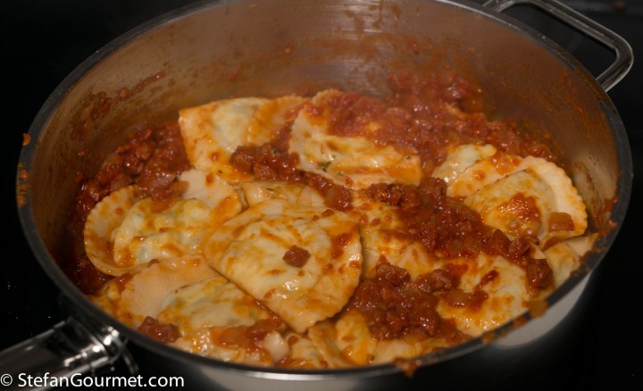 When you’ve added all of the ravioli, very gently toss them to cover with the ragù.
