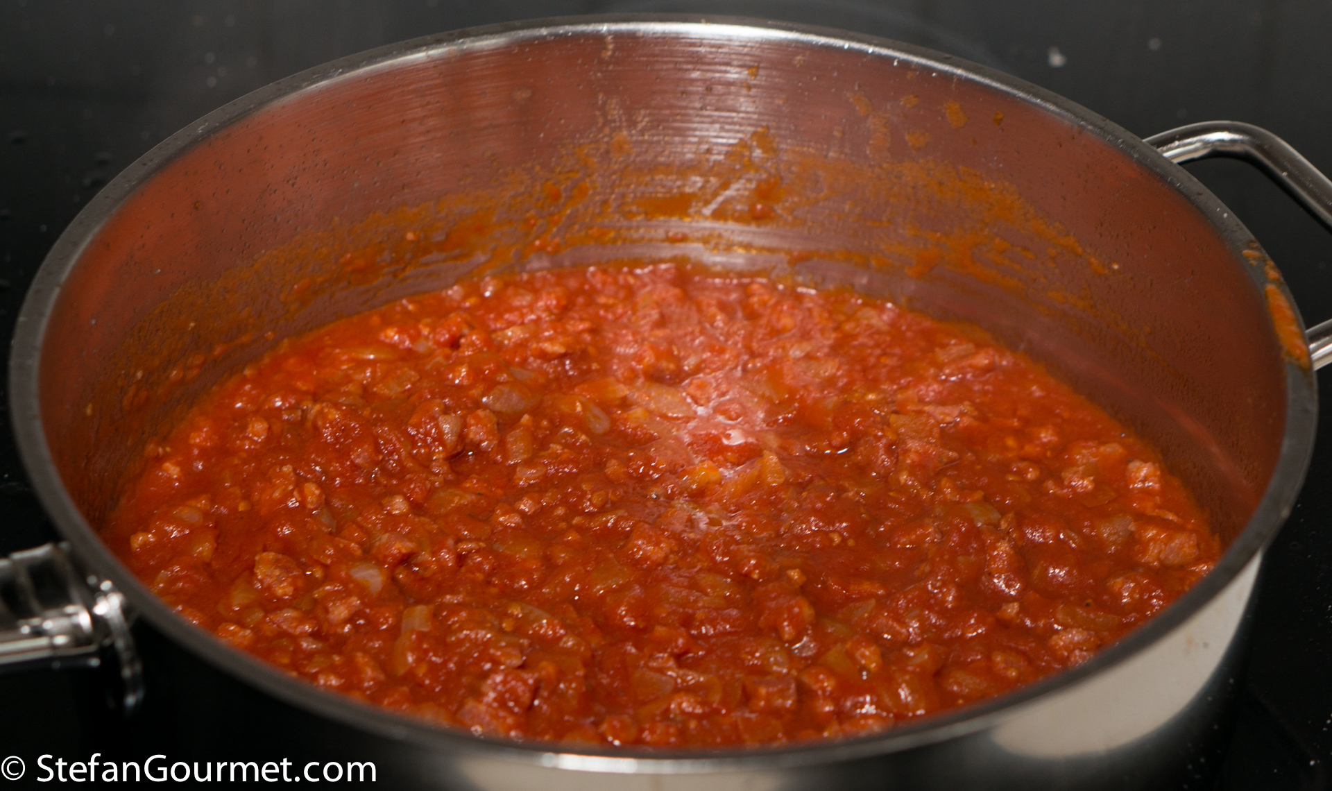 Make the ragù while the ravioli are drying. Heat 2 tablespoons of olive oil in a frying pan. Add a chopped onion and season lightly with salt. Stir until the onion is translucent, about a minute.