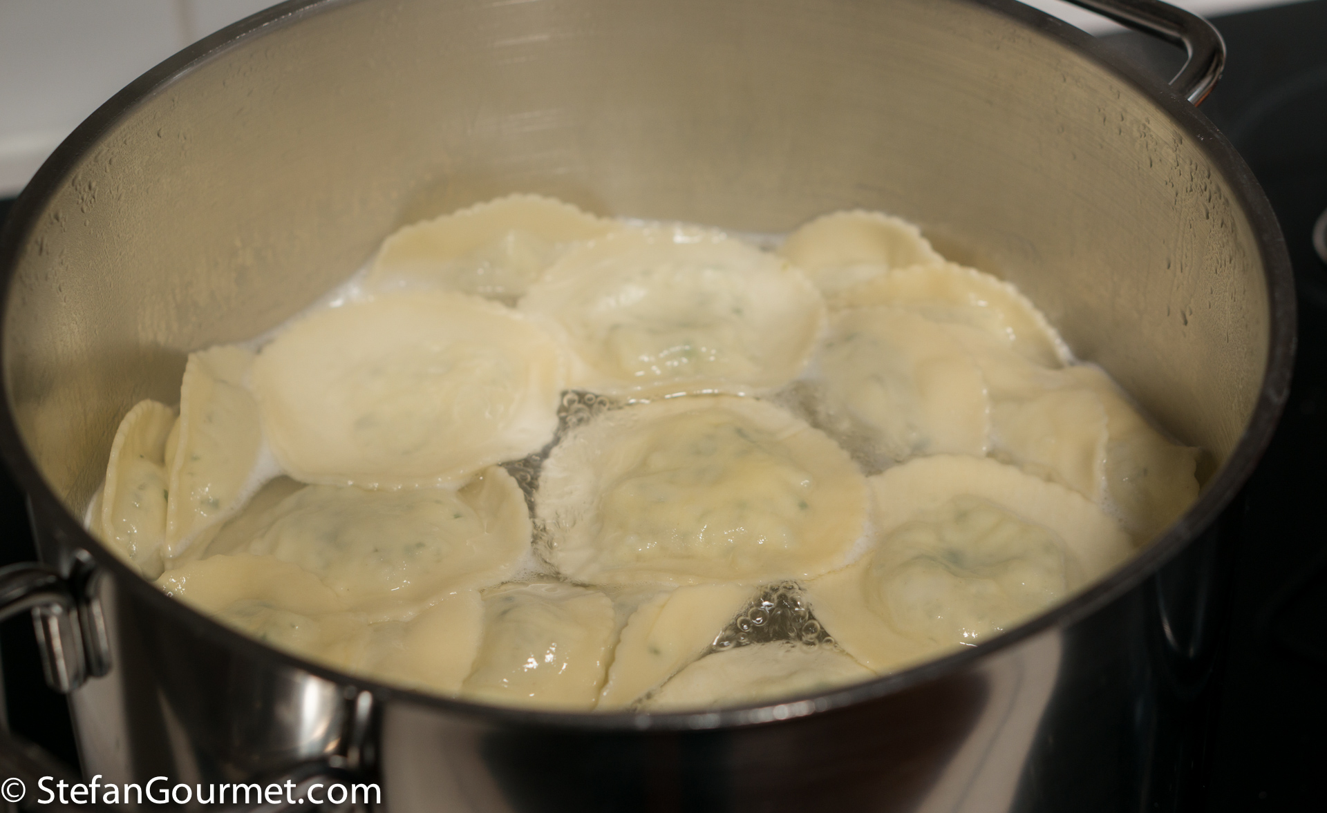 Bring a large pot of water to a boil. Add salt and the ravioli. Cook them for 1 to 2 minutes, depending on how long you allowed them to dry. (If they still feel quite soft, 1 minute will probably suffice. It is nice to keep the pasta al dente.)