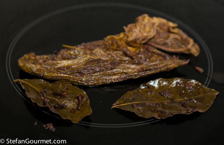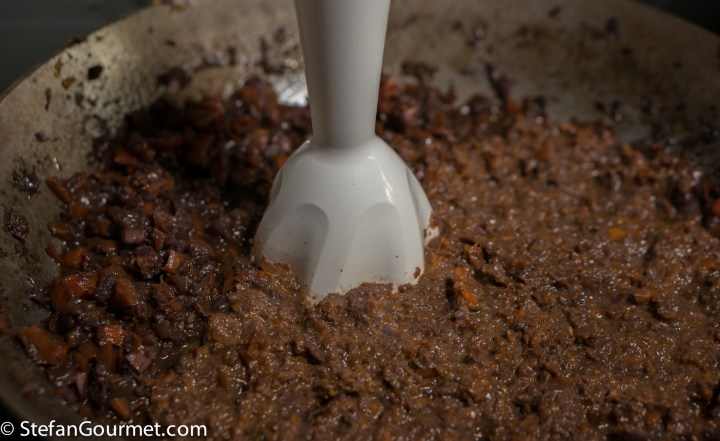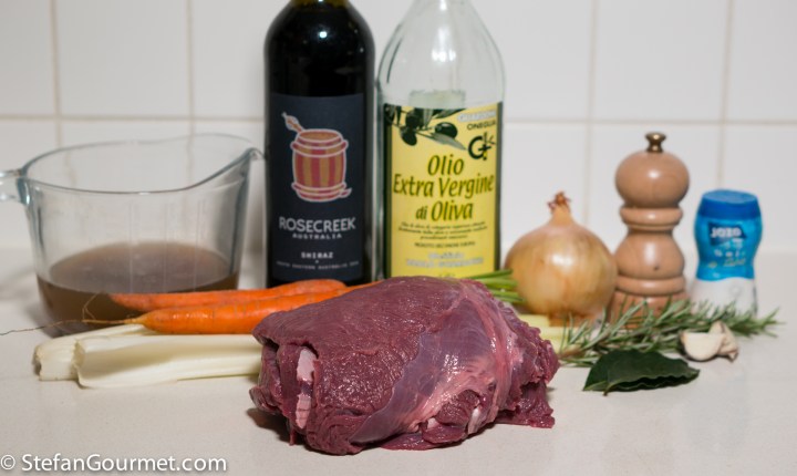 This way of preparing sous-vide braised venison was inspired by a recipe from Piemonte in Italy to braise beef in red wine (or more specifically, in Barolo): Brasato al Barolo. The traditional recipe tells you to marinate the meat in the wine before cooking, but that is not necessary at all if you are going to cook it sous-vide for 24 hours anyway. You can make the same dish on the stovetop or in the oven, but the nice thing about doing it sous-vide is that thanks to the accurate temperature control it will always be tender and never be dry. Traditionally prepared the meat often turns out dry and then it is the delicious sauce (made with red wine, carrot, onion, celery, and stock) that rescues the dish. When you make it sous-vide the sauce will be as delcious, but the meat will be more juicy and tender. This was nice with cardoon gratin as a side and would be a great dish for the holidays. I used neck of venison, but another tough cut like shoulder would also work well.