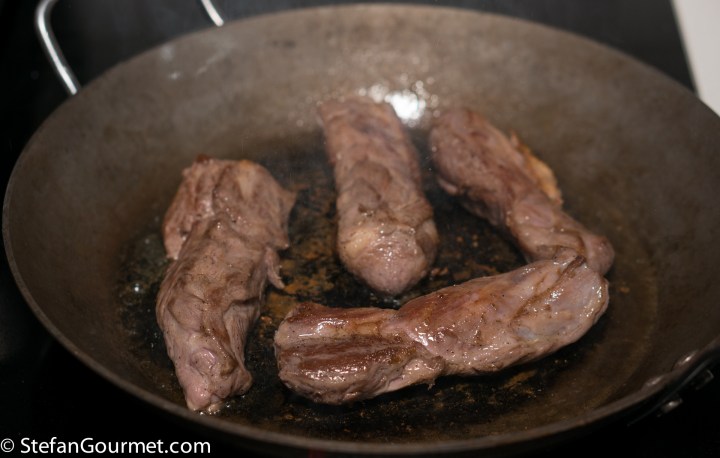 Brown them on all sides to develop the flavor, then put them aside on a plate to cool. Turn off the heat.