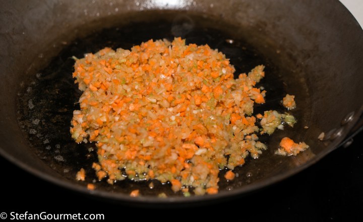 Add minced carrot, celery, onion, and garlic. Season with salt.